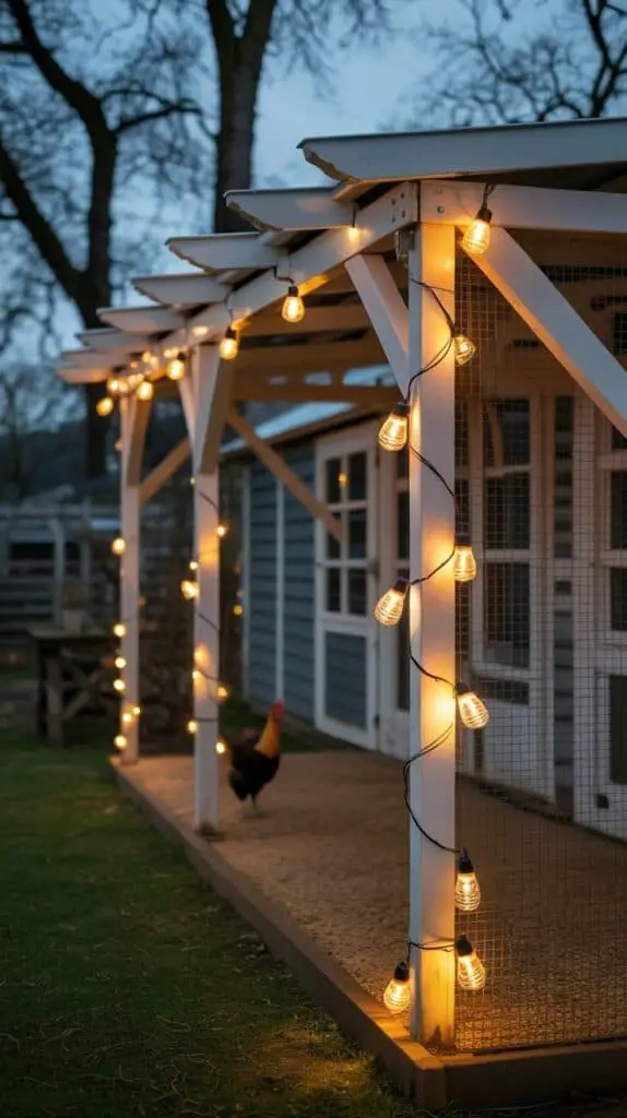 Warm white solar fairy lights or lanterns create a magical winter feel without needing electricity. Wrap them loosely around fence posts, coop trim, or pergola beams if your chicken yard has them. Keep lights high enough that curious hens can’t reach them, and choose soft warm lighting instead of flashing colours to maintain a calm atmosphere. At night, it gives the entire yard a welcoming, farmhouse-winter look.