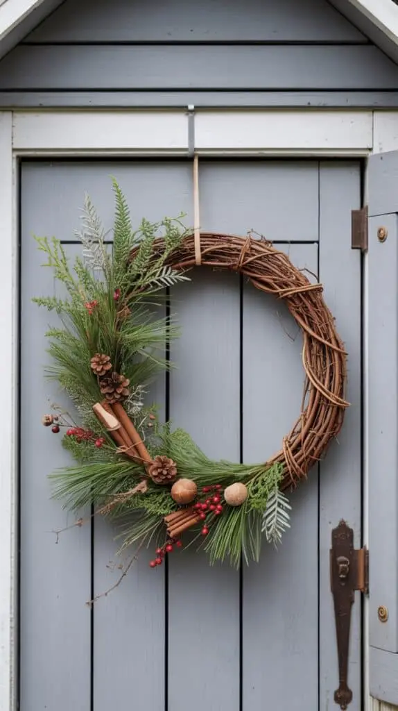 A small wreath made of pine sprigs, dried herbs, or grapevine adds a charming seasonal touch to the coop. You can add non-toxic elements like dried berries, cinnamon sticks, or small pinecones. The wreath stays high on the door where chickens can’t pick at it, and it creates a lovely focal point when you walk into the yard. It’s simple, natural, and perfectly festive.