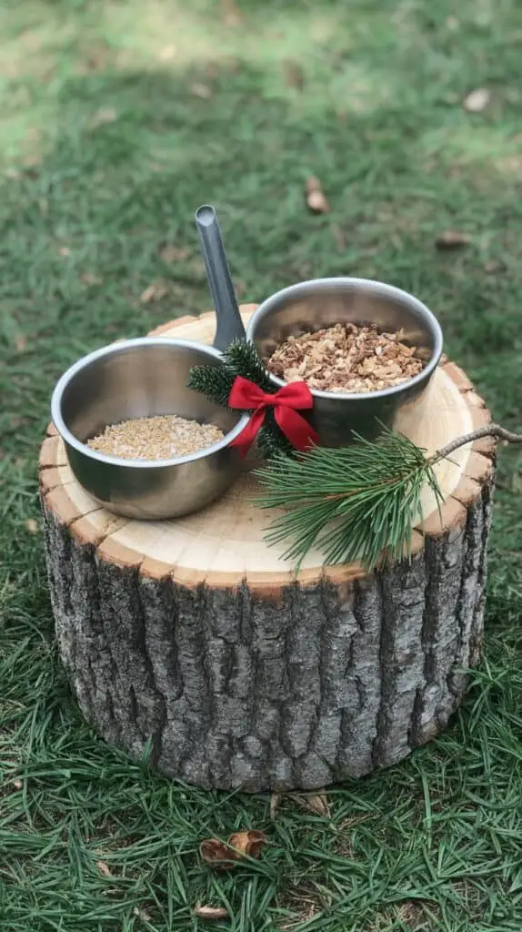 Place feed bowls or scratch dishes on a wooden slab or tree stump to create a quaint little winter feeding station. Add a sprig of pine on the side or tie a small bow around the handle of a metal scoop for a subtle festive detail. It’s safe, functional, and gives your chicken yard a thoughtfully decorated look.