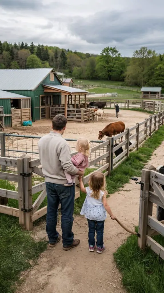 On a family-friendly hobby farm, kids don’t need to be fenced off from farm life — they just need safe visibility. Position play areas or picnic tables where adults can see animals and children at the same time.