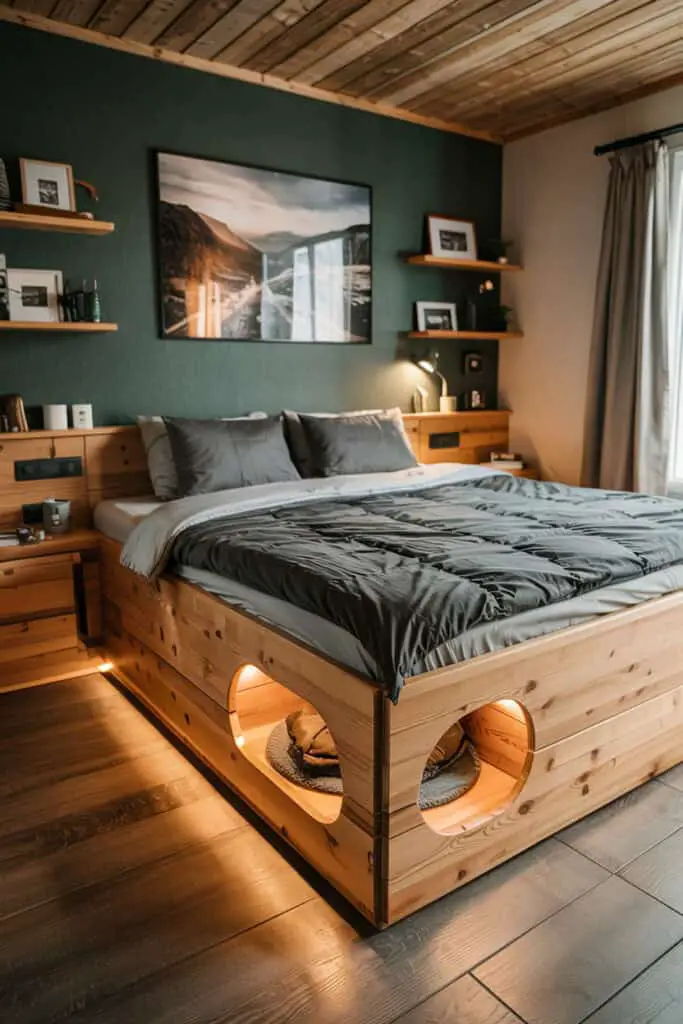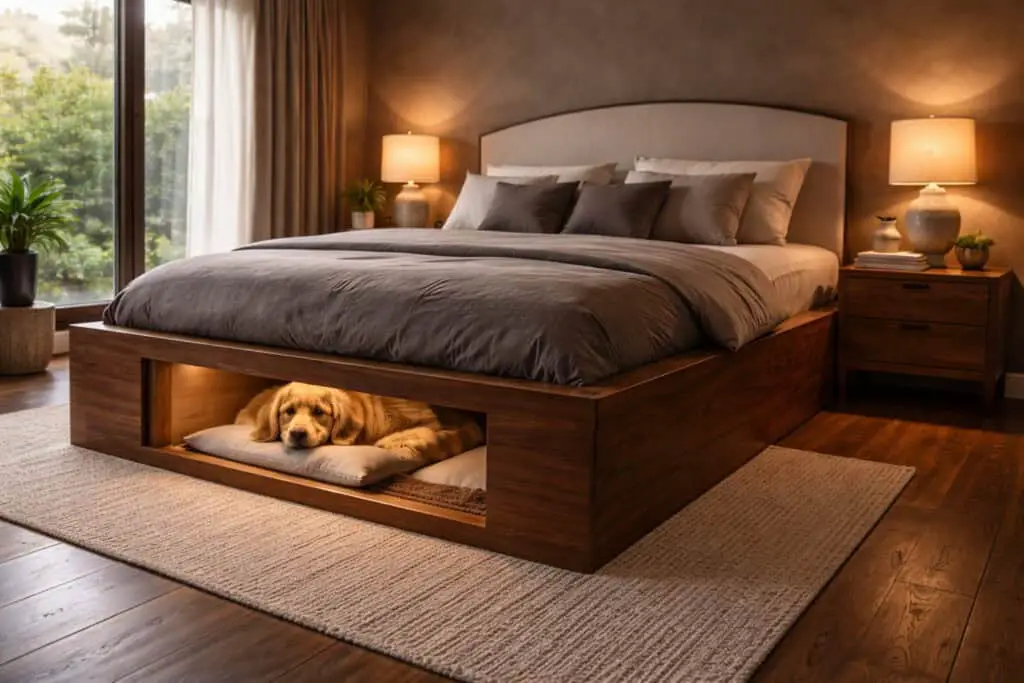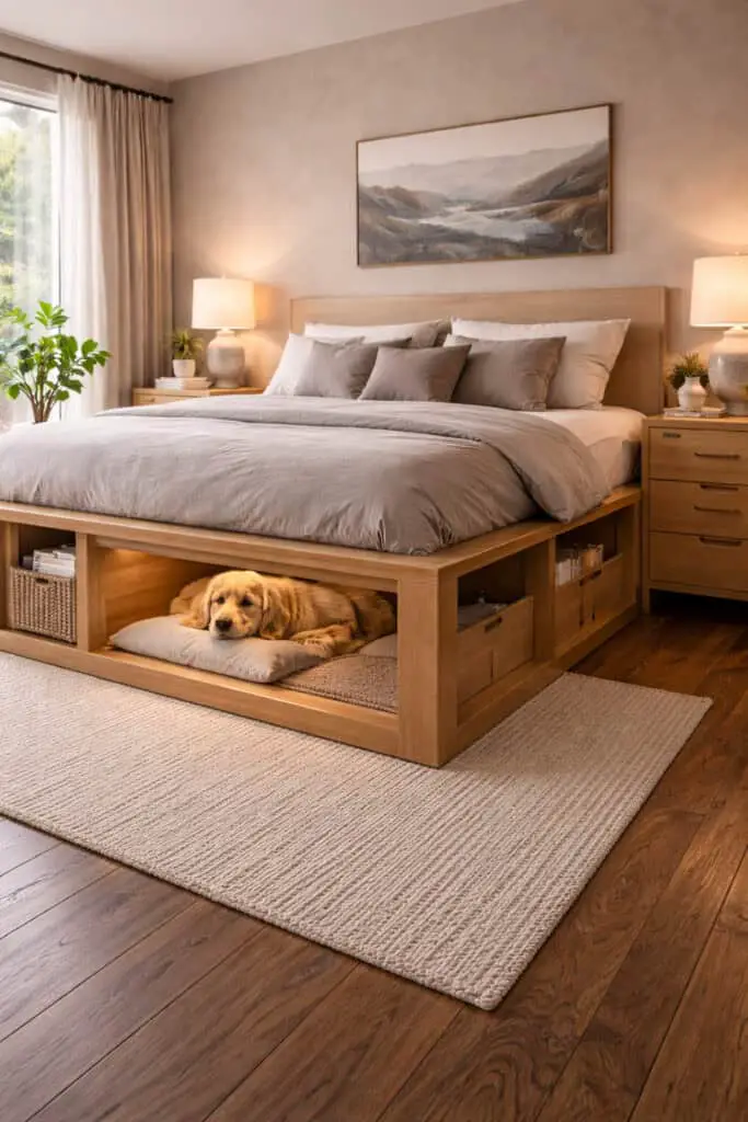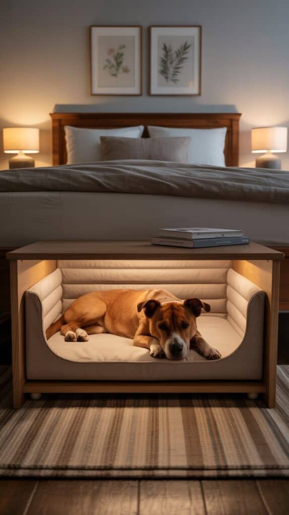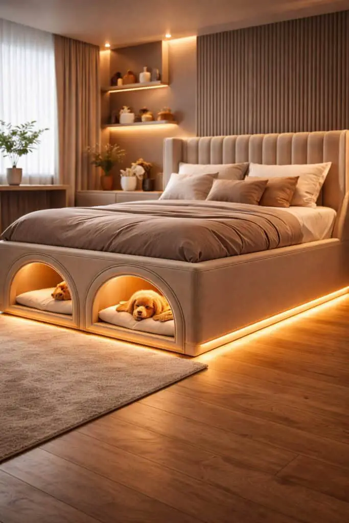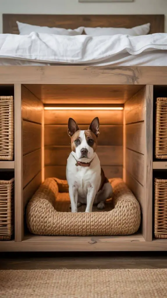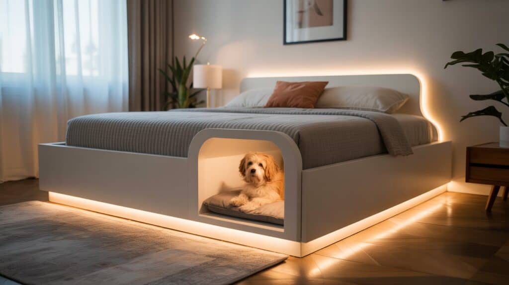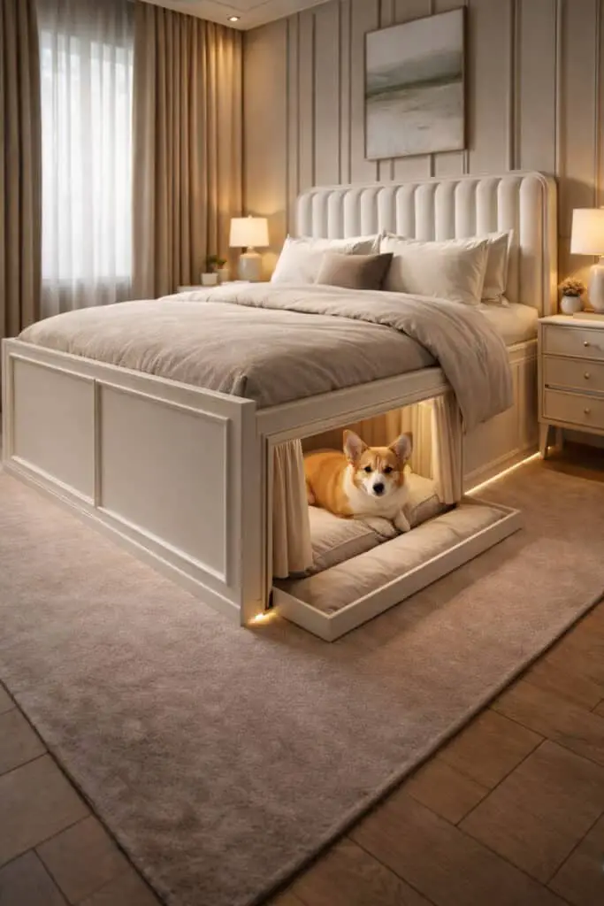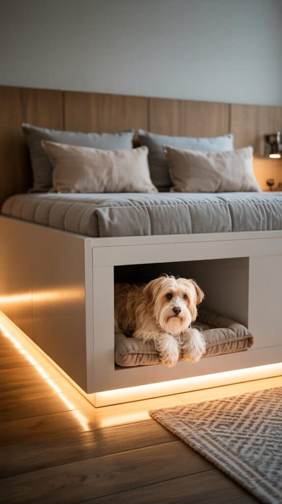In this setup, the underbed dog nook includes dimmable lighting connected to your bedside lamps or smart lighting system. As you lower the room’s light in the evening, the nook maintains a gentle glow so your dog feels secure. A neutral, padded mattress and low side panels create a den-like feeling that encourages restful sleep. It becomes part of your shared nighttime routine.