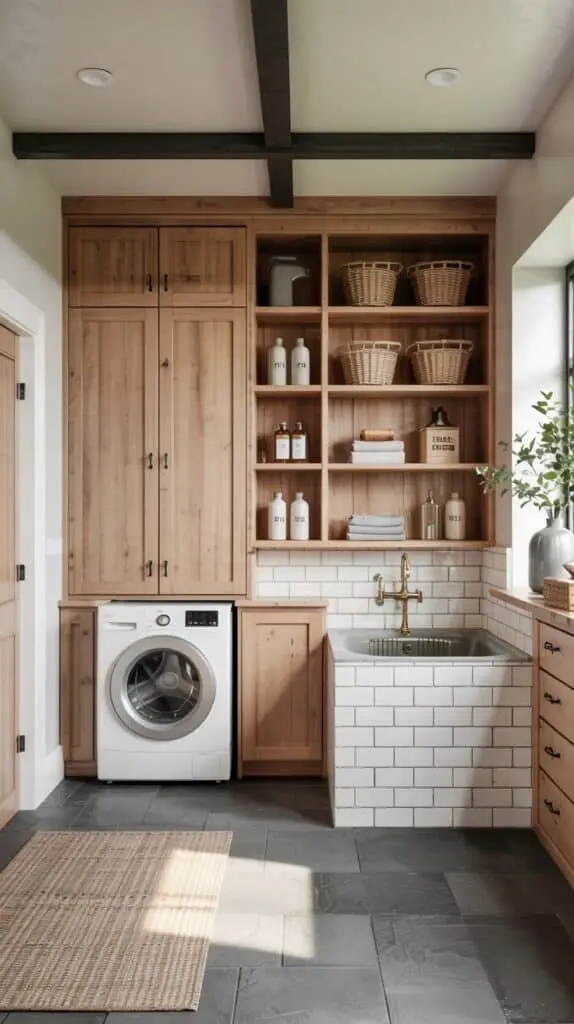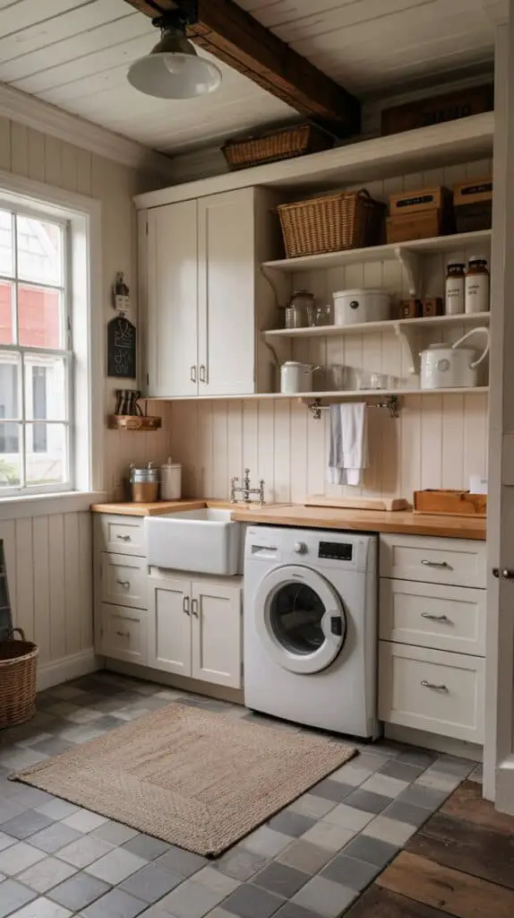 If your laundry room is close to the kitchen (or shares finishes with it), it’s smart to borrow a few cues from farmhouse kitchen design so the home feels cohesive.