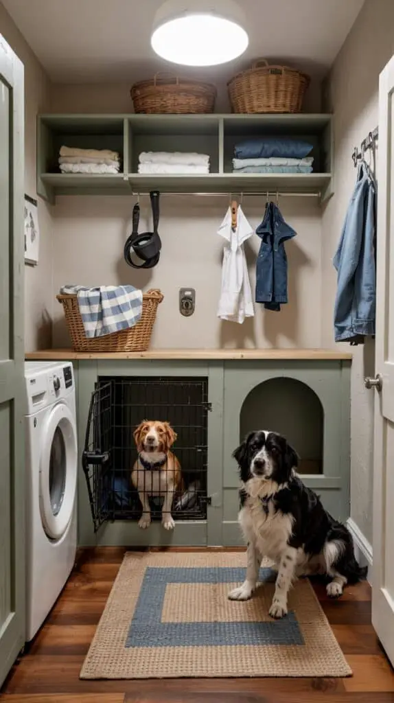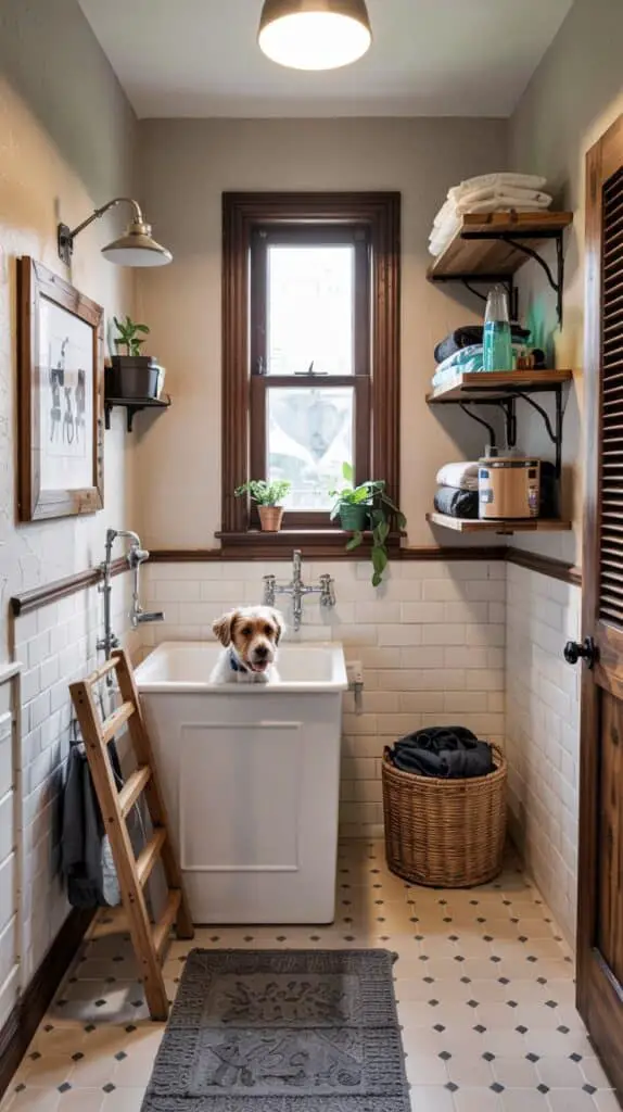 Dogs tend to hover. If you’re washing one dog, the other one wants to watch. If you’re folding laundry, they’re right underfoot. Planning a small “wait spot” makes the room feel calmer and safer.