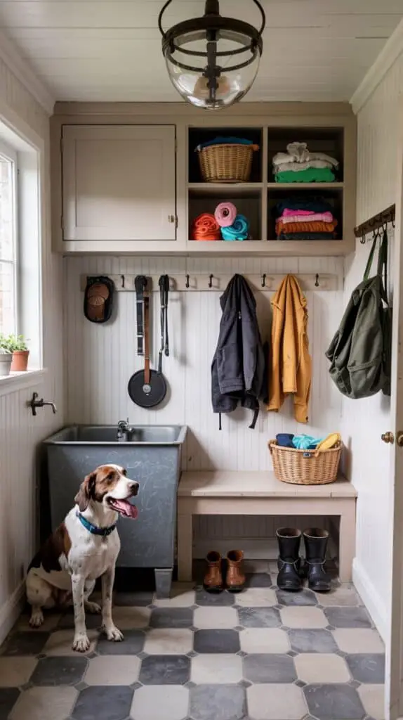 Before you pick tile or paint, plan the layout like you’re creating two zones: wet and dry. The wet side includes the pet wash station, space for towels, and a place to hang a leash. The dry side is your folding, sorting, and storage area.