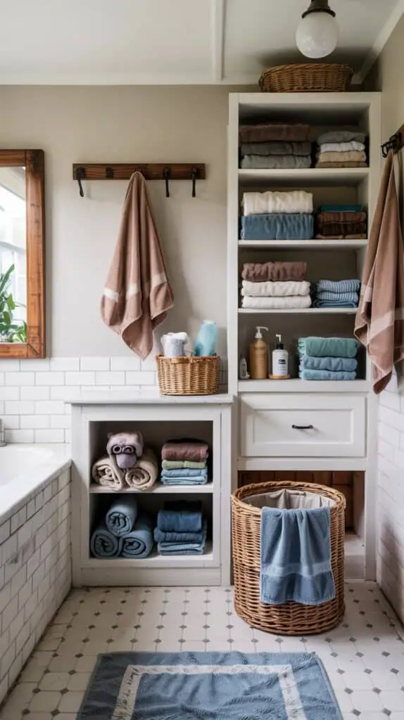 - Open cubbies near the tub (rolled towels look tidy and calm)