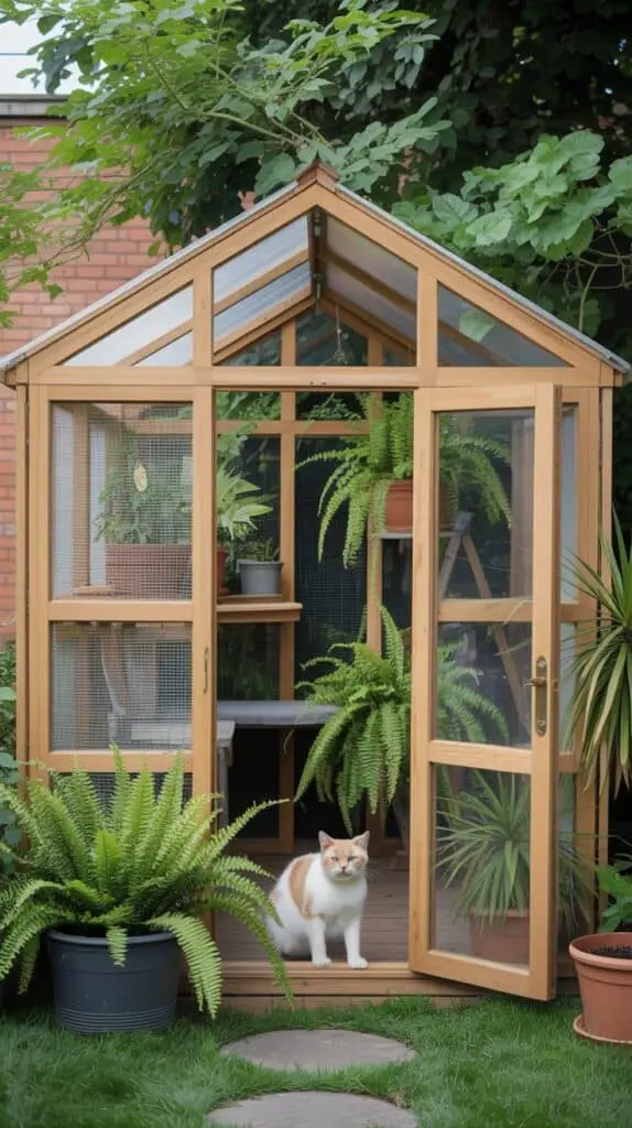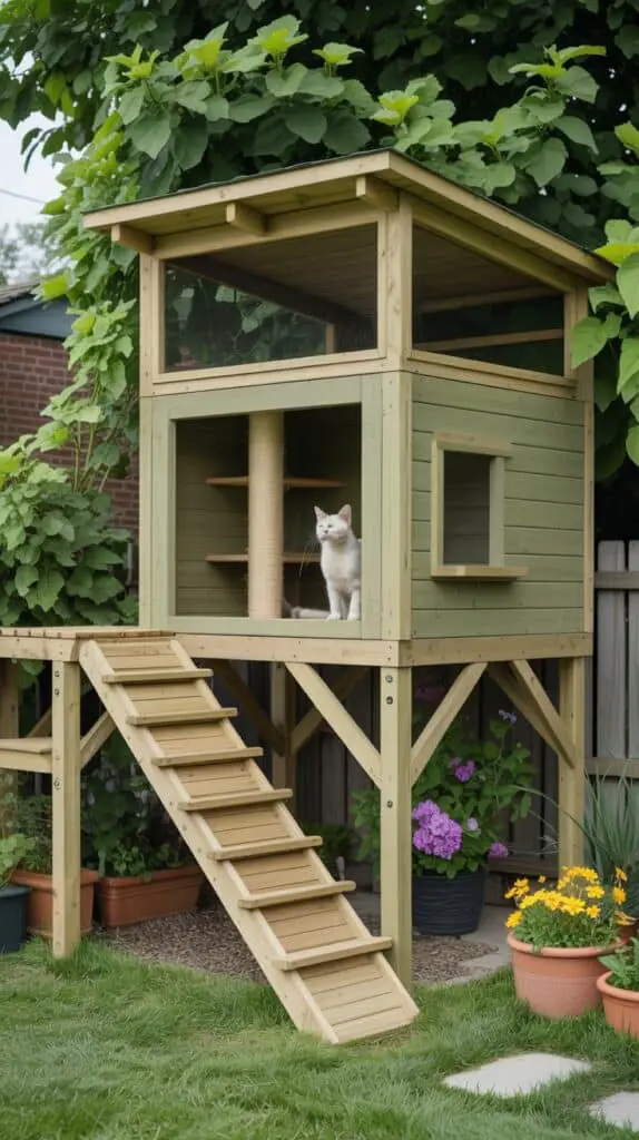 This outdoor room is built on stilts or a raised deck, giving your cat a “treehouse” view over the garden.
