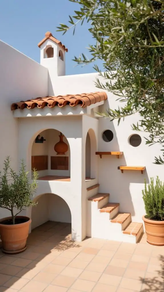 Think light stucco textures, terracotta accents, and olive trees.