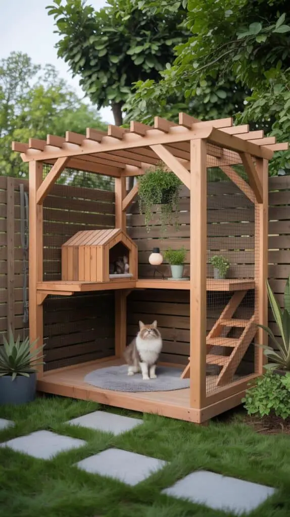 Add hanging plants, soft pathway lighting, and a raised viewing deck to turn it into a luxury outdoor cat lounge.