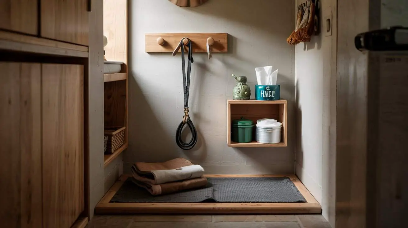 If you have a narrow hallway entry, go slimmer. Choose a low-profile bed or mat that sits flush against the wall and doesn’t pinch the walking space. Install two hooks and a narrow shelf above. If you can’t fit a basket on the shelf, use a small wall-mounted pouch or a slim hanging organizer for bags and wipes. The goal is still the same: a defined dogs corner in house that doesn’t block traffic.