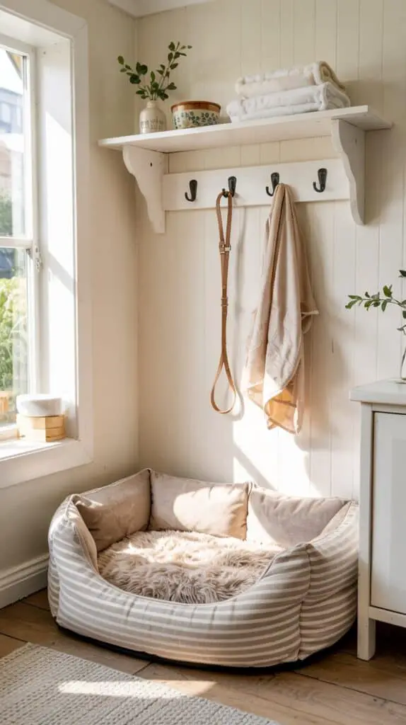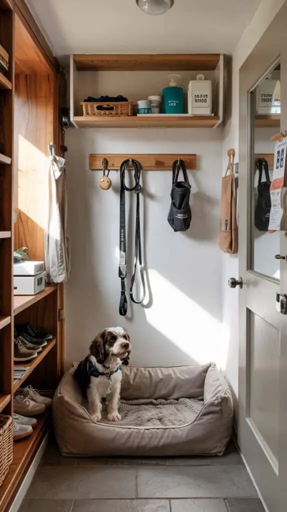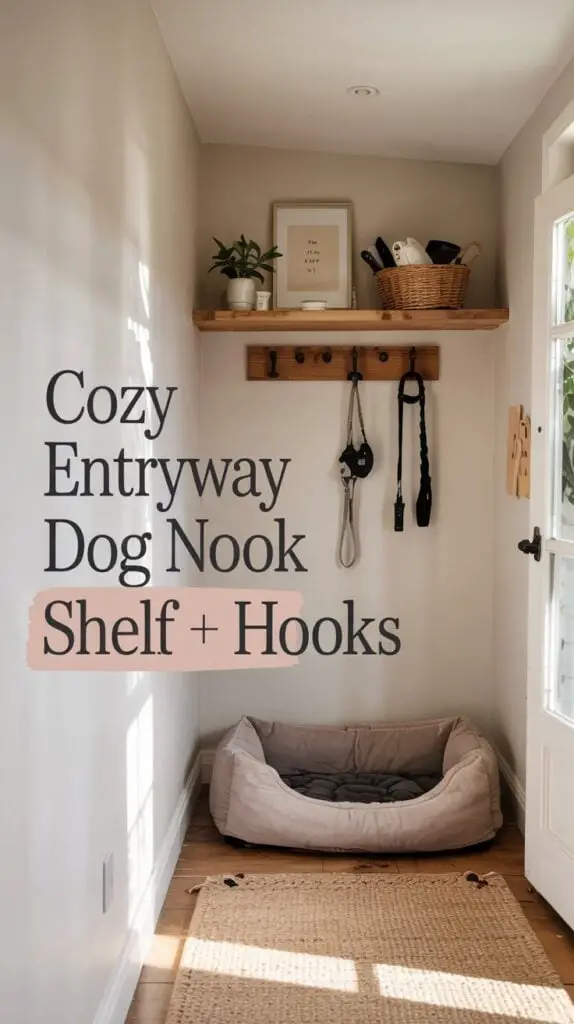 The heart of this entryway solution is the wall setup. A small shelf plus hooks is enough to make your routine smoother without cluttering the space. It’s one of those dog nook ideas that looks tidy even when you’re rushing out the door, because everything has a home.