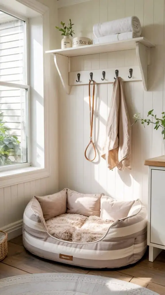 This setup doesn’t need to be expensive to look good. A basic shelf, two hooks, and a soft bed can create a dog nook in bedroom vibes—calm, cozy, contained—even though it’s right at the front door.