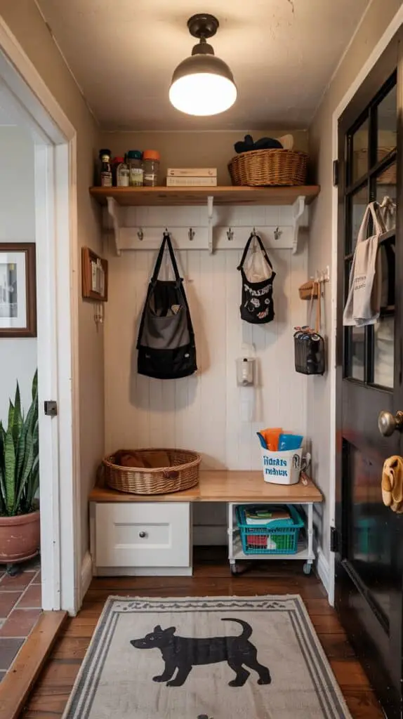 Now focus on cleaning—because cozy only stays cozy when it’s easy to maintain. Choose materials you can wipe down quickly. A small tray on the shelf catches dirt from bag dispensers and keys. A basket with a liner can be shaken out. If your dog sheds heavily, keep a lint roller in the shelf basket so you can grab it on the way out without rummaging.
