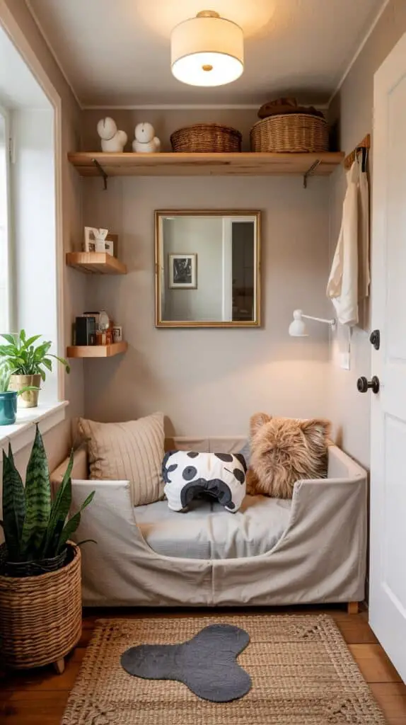 If you want to add a little warmth without adding clutter, place one small framed photo, a simple print, or a small plant on the shelf—something that matches your overall home style. This is where cozy dog bed decor can feel intentional without feeling staged. You’re making it pleasant to look at, but still practical.