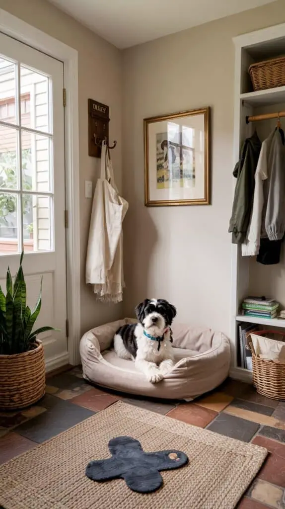 If you have kids, build in a simple rule: dog bed stays clear. No backpacks on the bed, no shoes on the rug. When the family respects the dog’s space, the nook actually functions as a cozy spot instead of a constant conflict zone. You can even assign one hook as the “kid leash hook” if a child helps with walks, so everything stays organized.