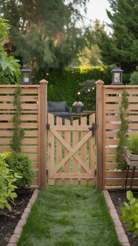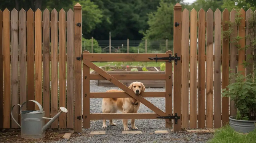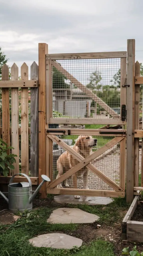 For that farmhouse feel, go with natural wood fencing and a split gate (like a mini barn door). It adds charm and keeps the dogs in when you’re loading up wheelbarrows or chasing toddlers.
