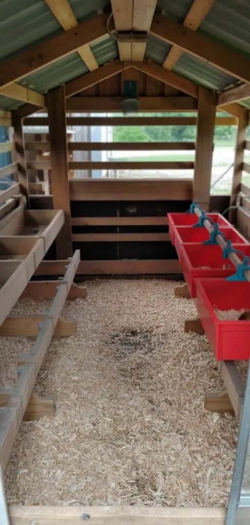 Try to place the nesting boxes on the side of the coop that’s closest to your usual path—so you don’t have to trek around the run every morning. Feeders and waterers should go in an area with good clearance and no bedding buildup.