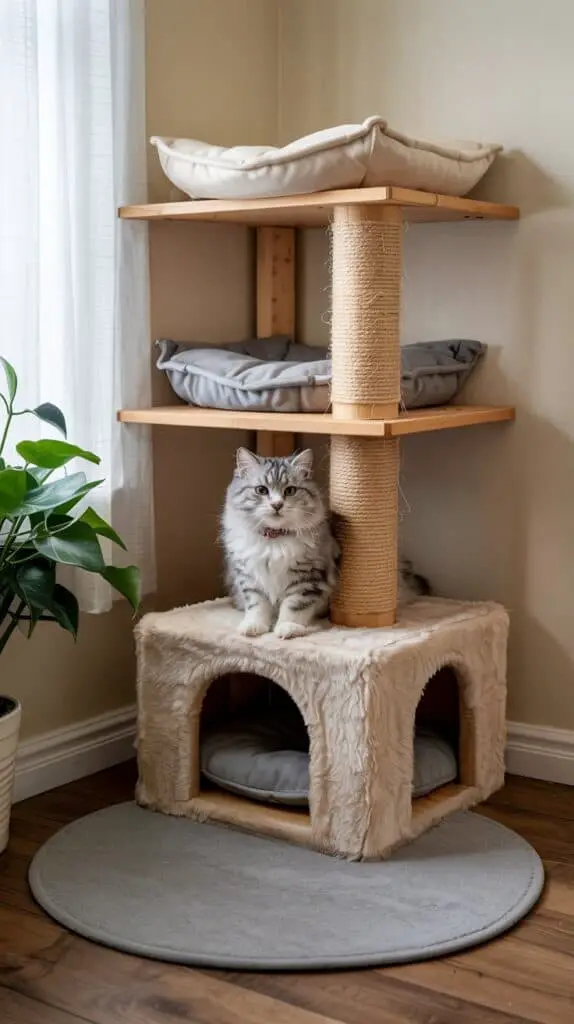Start by deciding where the tower will live and what “cozy” means in that corner. A spot near a window is ideal, but any quiet corner works if it’s away from busy walkways. For most homes, a tower around 4–5 feet tall feels tall enough to be satisfying without getting wobbly. If you’re working with cat room ideas small spaces DIY constraints, a wider base matters more than extra height—cats love stable landings.