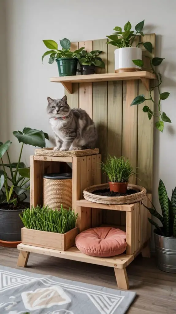 The garden vibe should be controlled and tidy indoors. Instead of thinking “lots of plants,” think “one or two intentional green touches.” The safest, simplest option is a cat grass pot placed in a heavy container on a lower level—something your cat is allowed to chew. To keep soil from becoming a hobby, set the pot inside a tray or a wooden side box with a waterproof liner. If your cat is the type to knock things off ledges, keep all planters off the top perch and away from the jumping path.