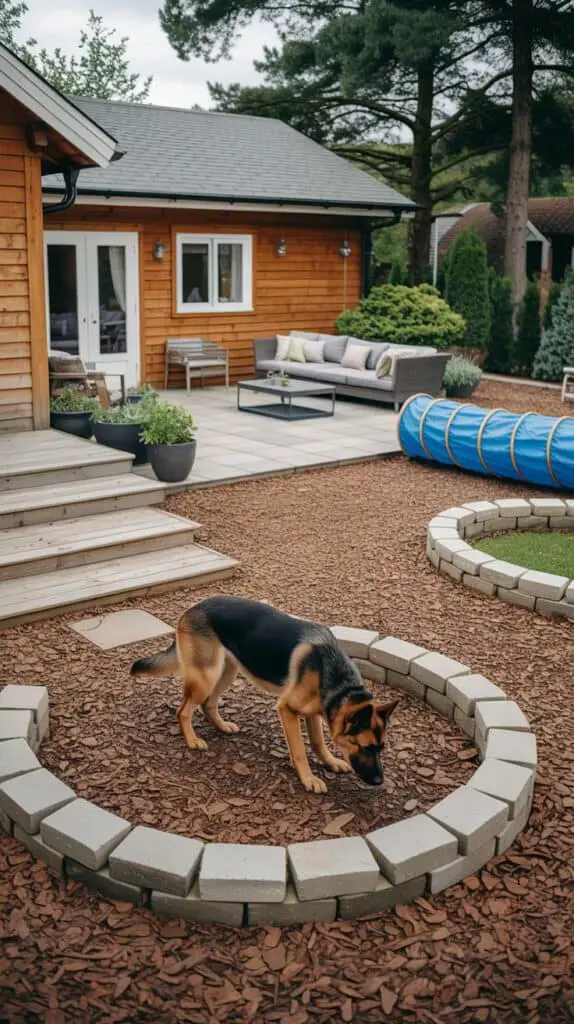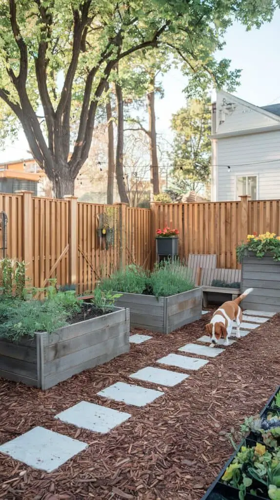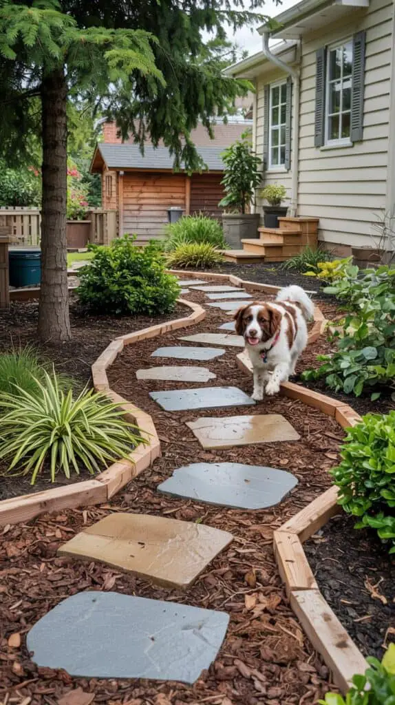 This keeps the yard feeling structured instead of “just mulch everywhere.” Dogs naturally follow the same paths daily, so using mulch along their routes keeps the space clean and your home less messy. It also gives the whole yard a modern, well-planned look without needing professional landscaping.