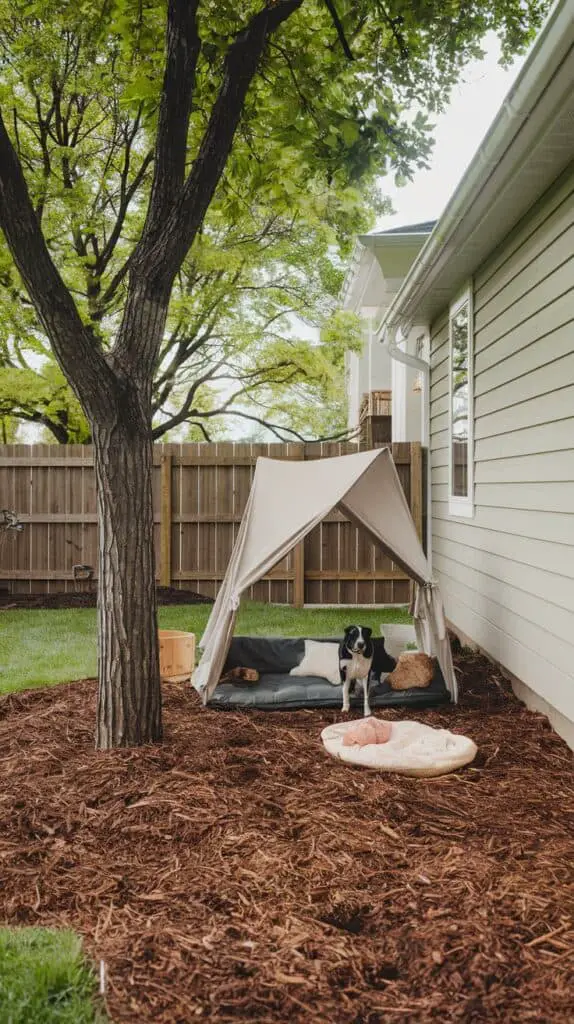 Most dogs love having a dedicated spot they can claim as their own. Create a small mulched nook under a tree, beside your patio, or next to the house where they can sunbathe or hang out. Add a simple outdoor dog bed, a shade canopy, or a raised water bowl to make it feel extra cozy. For dogs who love enrichment, hide toys under the mulch occasionally or create a mini digging corner with a softer mulch blend. This helps redirect digging away from your garden beds and gives your dog a fun activity that works in all seasons.