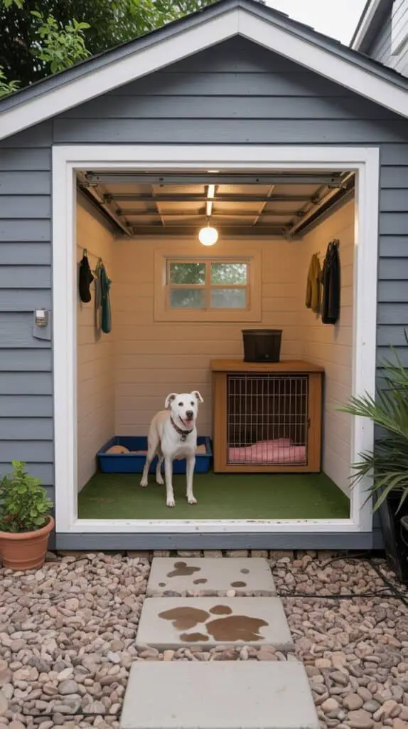 If your dog likes to be indoors and outdoors, turn your garage into a dog zone with a connected run or access door into the yard. It works well in bad weather and gives your dog freedom without full yard access.