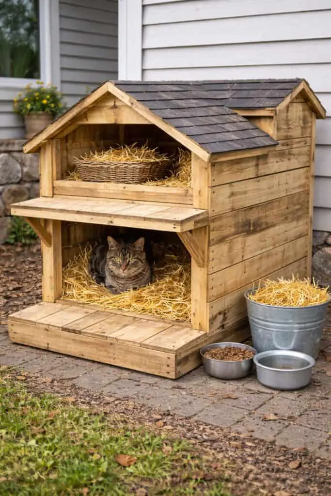 This style works well as a DIY insulated cat house for outdoor rescue spaces because pallets are easy to find and simple to assemble. The raised design also keeps cats off cold ground while giving them multiple quiet spots to rest. Placing the shelter against a wall, fence, or in a covered garden corner helps it blend naturally into a cat garden outdoor setup.