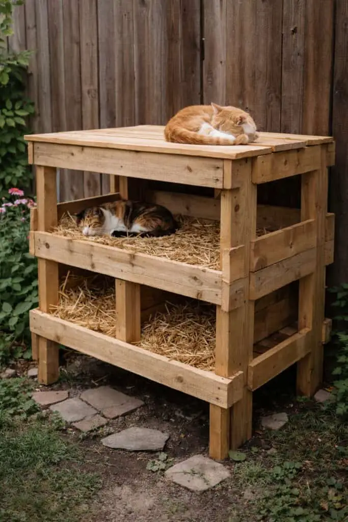Pallet cat houses like these create a safe, sheltered resting space for stray or community cats. Built from stacked wooden pallets, the design forms several cubbies where cats can curl up away from wind and rain. Filling each compartment with straw helps trap warmth and keeps the sleeping areas dry.