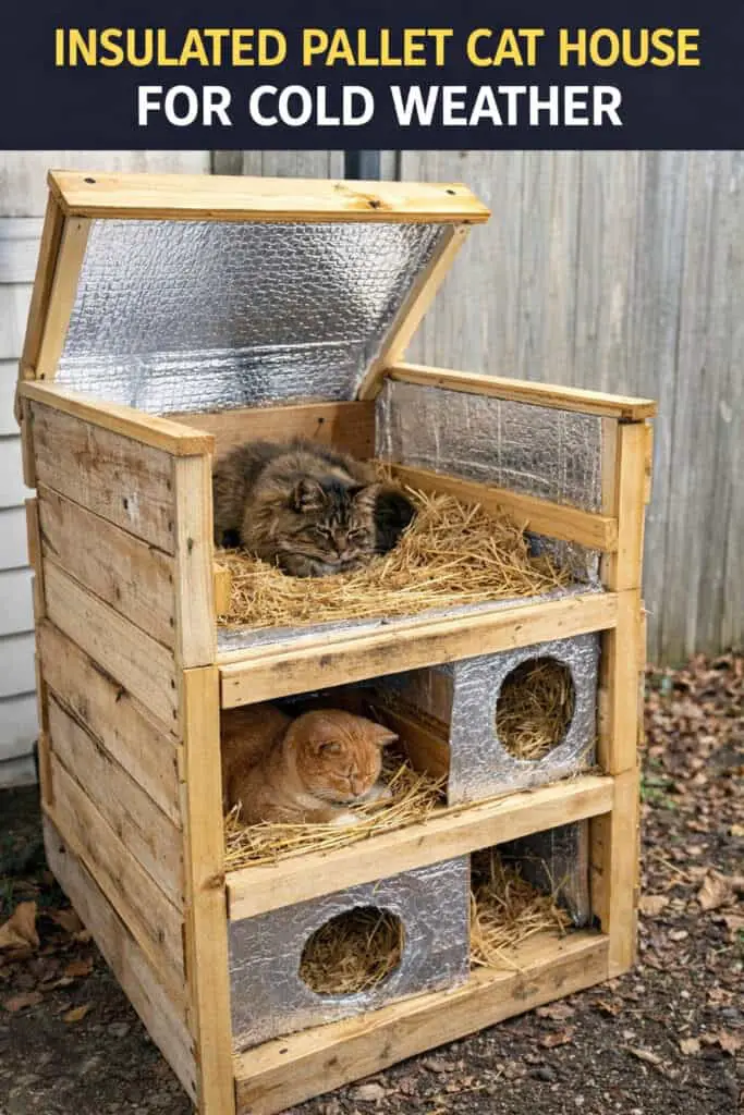 Lining the interior walls with foam board or reflective insulation helps trap body heat during colder months. A simple pallet cat house outdoor design can be upgraded with a removable roof for easy straw replacement. Keeping entrances small reduces wind exposure while maintaining airflow. For feral cat helpers, this practical design balances comfort and function without overcomplication.