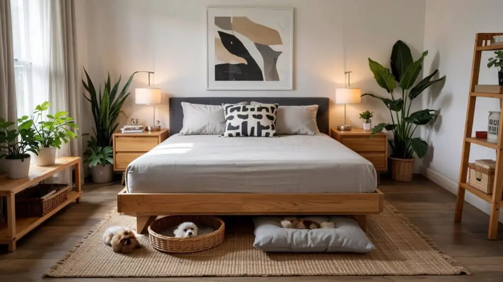 The simplest version is also the most versatile: a clean-lined platform bed with enough clearance underneath to create a pet zone that feels like a built-in cubby. This works especially well if you’re aiming for a modern bedroom that doesn’t look “pet themed,” because the pet bed becomes part of the architecture of the room instead of another object on the floor.