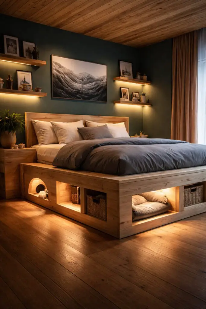 This is also the easiest approach for renters: you’re not permanently altering anything. If you can’t replace your bed, you can “fake” the look by adding a bed riser system plus a tidy under-bed drawer unit on one side and a pet nook on the other. It still reads as purposeful, and it still clears floor space—especially important if you’re working with a small room.