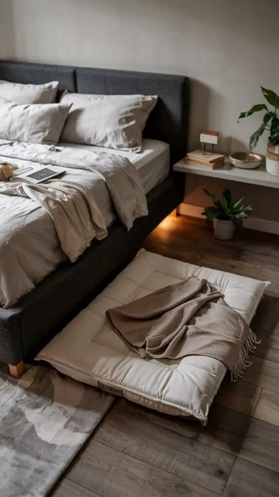 To keep it visually calm, coordinate the under-bed “zones” with matching materials. Use the same style of bins on the storage side, and similar textiles on the pet side. If your bedroom is neutral, keep pet blankets neutral too. If your room leans warm wood tones, choose tan, camel, and cream bedding for the pets. This is the simplest way to make the whole arrangement feel like part of the bedroom, not a separate “pet corner.”