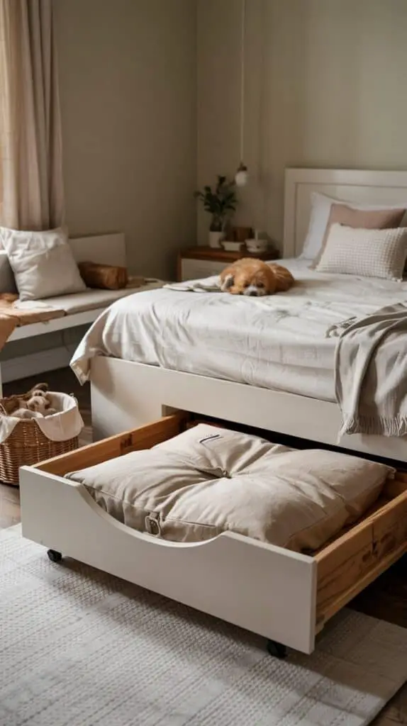 If you want the under-bed pet area to feel truly built-in—like furniture design, not just a tucked-away cushion—a pull-out drawer style is one of the most satisfying options. It’s also a great idea if your dog tracks in dirt or your cat sheds heavily, because you can pull everything out to clean instead of crawling under the bed.