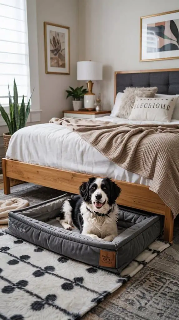 If you have more than one pet—or one pet who’s a sprawler—you can make the under-bed area work like a little “shared suite” instead of one crowded pad. This is one of those stylish pet bedroom ideas that also helps everyone sleep better, because pets aren’t competing for the same spot.
